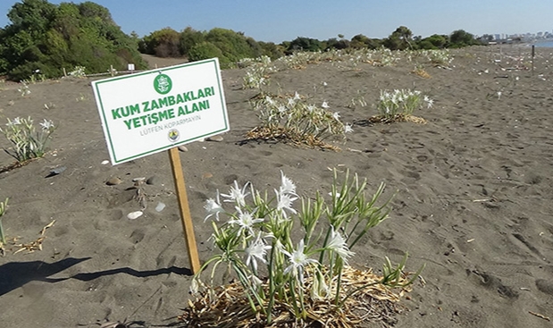 Mersin'in Erdemli ilçesinde koparılması yasak olan kum zambaklarının çiçeklendiği kumsalda güvenlik şeridi oluşturuldu.