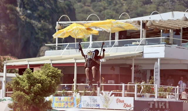 Galatasaray'ın şampiyonluk kupası Muğla'nın Fethiye ilçesinde yamaç paraşütüyle uçuruldu.