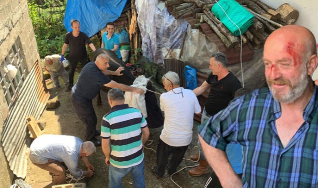 Rize'de bağlı olduğu ağaçtan kurtulmaya çalışan boğa sahiplerine zor anlar yaşattı. Boğayı kesmeye çalışan kasap, aldığı darbe nedeniyle hafif yaralandı.