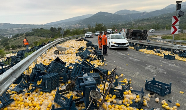Devrilen kamyon ve yola saçılan limonlar nedeniyle kapanan yol, çalışmaların ardından trafiğe açıldı.