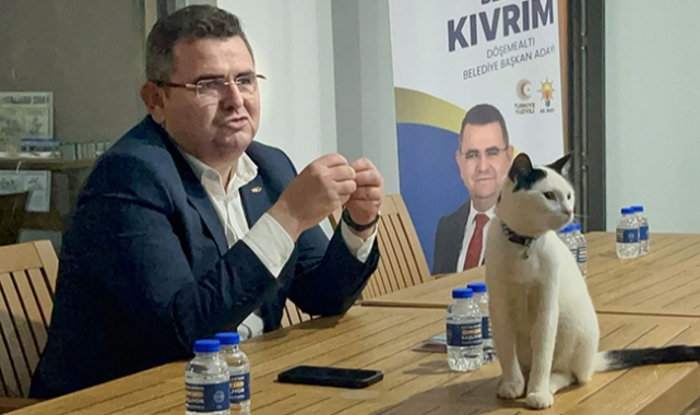 Antalya'da AK Parti Döşemealtı Belediye Başkan Adayı Bekir Kıvrım, mahalle toplantısında projelerini anlattığı sırada masaya çıkan kediyi görünce “Buraya bir hayvan mezarlığı kazandırmayı düşünüyoruz. Hayvanlar ölünce insanlar gömecek yer bulamıyor. İnşallah bu sorunu da ortadan kaldıracağız" dedi.