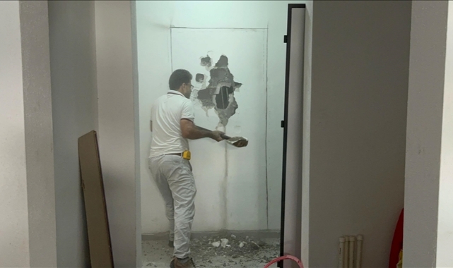 Kapının yerine örülen duvar işçiler tarafından balyozla kırıldığında ise daire girişinin banyo olarak düzenlendiği görüldü. İşçiler, duvarı kırdıktan sonra dairenin girişine yeni kapı taktı.