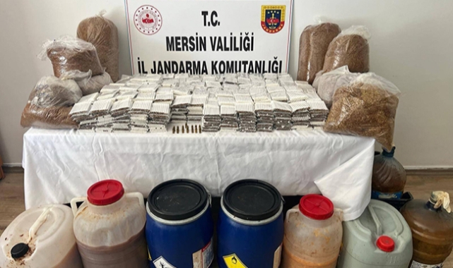Şüphelinin adresinde yapılan aramada 27 bin 250 makaron, 215 litre sahte içki, 29 kilo 700 gram tütün ve tabanca ele geçirildi.