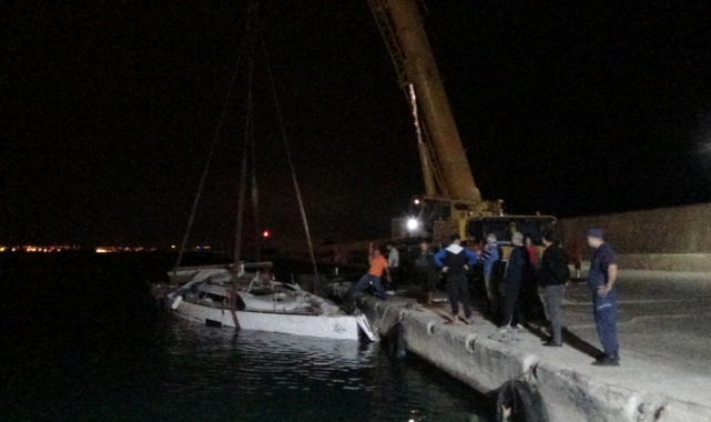 Dalgıçlardan birinin halat bağladığı tekne, balıkçı teknesinin yardımıyla yaklaşık 5 saatlik çalışmanın ardından Erdemli Balıkçı Barınağına getirilerek vinç yardımıyla denizden çıkarıldı.
