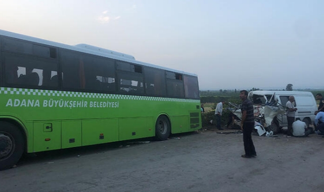 Adana'da, şehir içi yolcu taşımacılığı yapılan belediye otobüsü ile minibüsün kafa kafaya çarpıştığı kazada 3 kişi yaşamını yitirdi, 10 kişi de yaralandı.