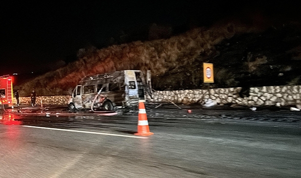 Y.E.S. idaresindeki 63 MA 2131 plakalı minibüs, Tarsus-Adana-Gaziantep (TAG) Otoyolu'nun Damlama mevkisinde seyir halindeyken henüz belirlenemeyen bir nedenle alev aldı.