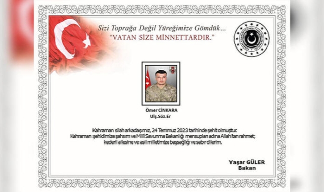 Bakanlıktan yapılan yazılı açıklamada, "Özalp, Van'da 24 Temmuz 2023 tarihinde silah kazası sonucu yaralanarak derhal hastaneye sevk edilen kahraman silah arkadaşımız Ulaştırma Sözleşmeli Er Ömer Cinkara yapılan tüm müdahalelere rağmen kurtarılamayarak şehit olmuştur. Bizleri derin bir acı ve üzüntüye boğan bu olayda hayatını kaybeden aziz şehidimize Allah'tan rahmet, kederli ailesine, Türk Silahlı Kuvvetleri ile asil milletimize başsağlığı ve sabır dileriz" denildi.