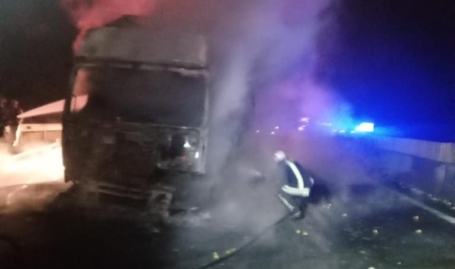 İtfaiye ekiplerince söndürülen yangın nedeniyle tırda hasar oluştu.