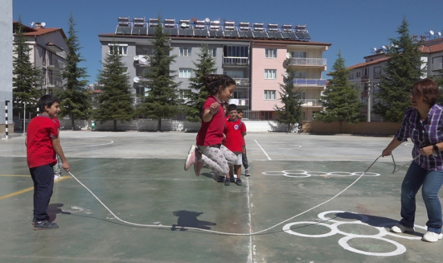 Burdur'da çocukların ekrandan uzak kalmaları için okul bahçeleri ip atlama, yakan top, seksek, köşe kapmaca gibi geleneksel çocuk oyunlarıyla donatıldı.