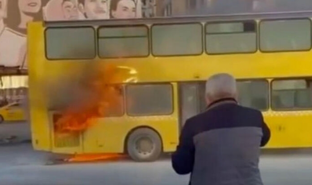 Kadıköy'de son durağa gelen çift katlı otobüsün motor kısmında yangın çıktı. İtfaiye ekiplerinin müdahale ettiği yangını çevredekiler cep telefonu kamerasıyla kaydetti.