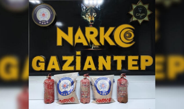 Gaziantep'te durdurulan otomobilde yapılan aramada, yangın tüpleri içerisine gizlenmiş 5 kilo 650 gram eroin ele geçirildi.