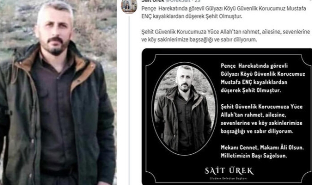 "Pençe Harekatı’nda görevli Gülyazı Köyü güvenlik korucumuz Mustafa Enç, kayalıklardan düşerek şehit olmuştur. Şehit güvenlik korucumuza yüce Allah’tan rahmet, ailesine, sevenlerine ve köy sakinlerimize başsağlığı ve sabır diliyorum."