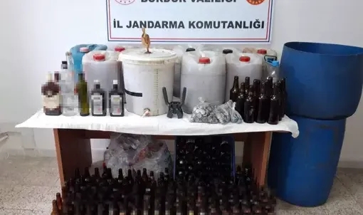Burdur İl Jandarma Komutanlığı R.S.'nin evine yaptığı operasyonda 400 litre şarap, 25 litre bira, 5 litre rakı, şişe kapatma aparatı, 150 boş bira şişesi ve 250 bira şişesi kapağı ele geçirdi.