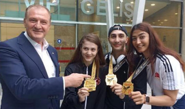 Azerbaycan'ın başkenti Bakü'de devam eden 26'ıncı Dünya Büyükler Tekvando Şampiyonası'nda rakiplerini yenerek altın madalya kazanan Nafia Kuş, Hakan Reçber ve Merve Dinçel, Türkiye Tekvando Federasyonu Başkanı Metin Şahin ile birlikte yurda dönüş yaptı. Esenboğa Havalimanı'na gelen milli tekvandocular ve federasyon başkanı Şahin, basın mensuplarına açıklamalarda bulundu.