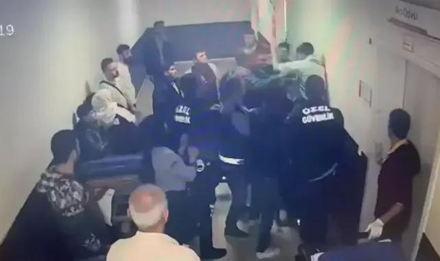 Görüntülerde, hastane koridorunda tartışma sırasında sedye üzerine çıkan kişinin doktora saldırdığı görülüyor.