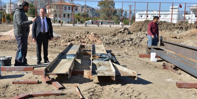 Konyaaltı Belediye Başkanı Muhittin Böcek, Liman Mahallesi Boğaçayı kenarında yapımına devam edilen Konyaaltı Belediyesi Spor Kompleksi inşaatı çalışmalarını yerinde inceledi