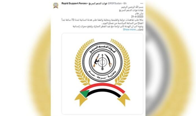 Sudan ordusuyla çatışan Hızlı Destek Güçleri (RSF) bugün açıklama yaparak Ramazan Bayramı sebebiyle 72 saatlik bir ateşkes konusunda anlaştıklarını duyurdu. Birleşmiş Milletler Genel Sekreteri Antonio Guterres dün taraflara çağrıda bulunarak Ramazan Bayramı münasebetiyle ateşkes çağrısında bulunmuştu.
