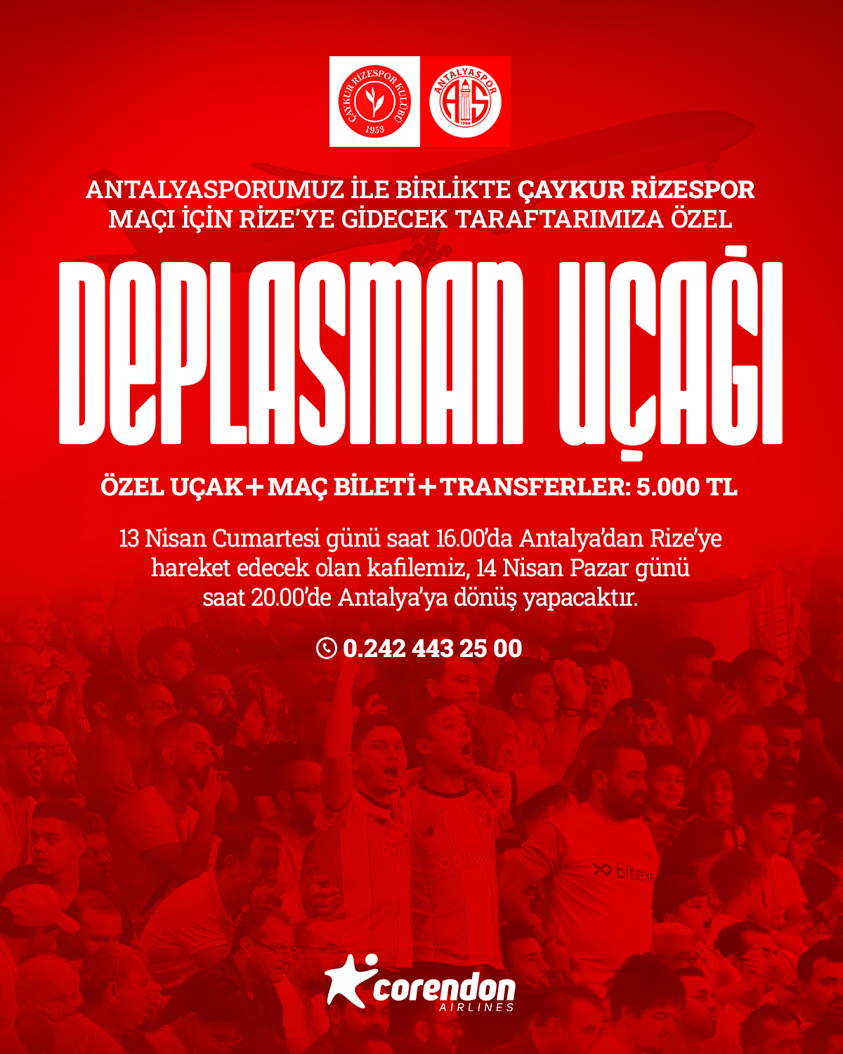 Öte yandan kulüpten yapılan açıklamada, Rizespor maçı için taraftara özel deplasman uçağı kaldırılacağı belirtildi. Açıklamada, özel uçakla deplasmana gitmek isteyen taraftarların rezervasyon yaptırması istendi. 1 kişiye maliyeti ise, özel uçak + maç bileti + transferler; 5.000,00 TL olarak belirtildi. Kulübün sosyal medya hesaplarından yaptığı paylaşımda,” 13 Nisan Cumartesi günü saat 16.00’da Antalya’dan Rize’ye hareket edecek olan kafilemiz, 14 Nisan Pazar günü saat 20.00’de Antalya’ya dönüş yapacaktır. Detaylı bilgi için 0242 443 25 00 numaralı telefon ile iletişime geçebilirsiniz” açıklaması yapıldı. (www.akdenizmanset.com.tr)