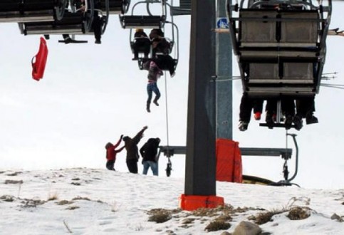 Telesiyej koltuğundan sarkan genç tatilciyi görenlerin bağırmasıyla telesiyeji durduran görevliler ve çevredekiler, genç kadının yaklaşık 6 metreden aşağı sarktığını gördü. Yaklaşık 5 dakika havada asılı kalan genç kadın, gücü tükenince aşağıda kendisini tutmaya çalışanların üzerine düştü.