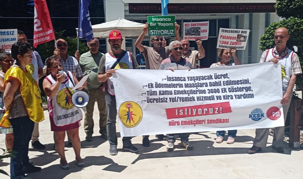 Zor koşullar ve vergi yükü ile mücadele ettiklerini hatırlatan Devrim Mol, “Büro Emekçileri Sendikası olarak her ay düzenli bir şekilde hesapladığımız Kamu Emekçilerinin Enflasyon Sepeti Araştırması’na göre Mayıs ayı aylık enflasyon rakamının yüzde 2,67 ve yıllık ise yüzde 98,02 çıktığını sizler aracılığı ile buradan kamuoyuna ilan ediyoruz. Bunun yanında bağımsız akademisyenlerce hesaplanan enflasyon rakamlarına göre aylık yüzde 7,35 yıllık ise yüzde 109,01 artış olmuş, Kamu Emekçileri olarak Mayıs ayında ücretlerimizde 14,48 puanlık enflasyon kaybına uğramış bulunmaktayız. Bunun yanında dövizin, altınının yükselişi önlenemiyor ve bizler sadece dünden bugüne yüzde 7 daha fakirleştik. Meyve sebzeyi taneyle aldığımız, kırmızı ve beyaz etin bizim için artık lüks tüketim haline geldiği, şehrimizde kira ortalamasının 10 bin lirayı geçtiği bir ortamda aylık enflasyonun yüzde 0.04 arttığını söylemek aklımızla alay etmekten başka bir şey değildir. SGK emekçileri olarak gecemiz gündüzümüze karışmış, canımızı dişimize takarak 85 milyon vatandaşa hizmet veriyoruz. Ancak açlık sınırında maaşlarımızla bu hizmetimizin karşılığını alamıyoruz. EYT linin aylıklarını yetiştirmeye çalışan, açlık sınırında maaş alan SGK emekçisi bizlerin, Anayasa Mahkemesi kararına rağmen hukuksuz bir şekilde ikramiyelerimiz gasp edildi, bu yetmedi 3600 ek gösterge kapsamı dışında bırakıldık. Bunlar da yetmezmiş gibi ekonomiyi düzeltme formülünü "Vergiyi, tabana yayacağız" ifadesi ile bu ülkenin ücretlileri, yoksulları, dar gelirlilerini zor günlerin beklediğini, zaten ağır vergi yükü olan bizlerin daha da ağırlaşacak ekonomik koşullar altında ağır vergi yükü altında daha da ezileceğimizi, bir kez daha krizin faturasını işçiye ve memura kesmeye hazırlandıklarını ifşa eden, bugünkü yoksulluğumuzun da sorumlularından birisi olan Hazine ve Maliye Bakanı Mehmet Şimşek ve emekçiye sırtını dönmüş iktidara sesleniyor, bu kadar iş yüküne, açlık sınırında maaşlara yeter diyoruz.Çalışan nüfusun ağır geçim sıkıntısını ‘mikro’ olarak görenlerin, patronları rahatlatmak için işçi ve emekçiye kemer sıktırmaya hazırlananların bilmesi gereken şudur ki; emekçilerin nefes alamadığı bir ülke ekonomisinin düzlüğe çıkma imkanı yoktur” diye konuştu.