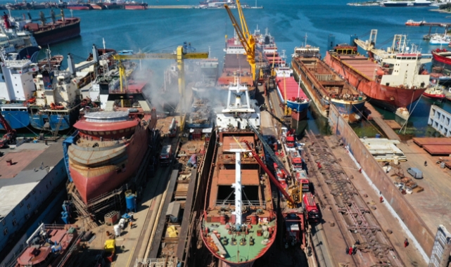 Tuzla'da tersanede bakıma alınan yük gemisinde yangın çıktı