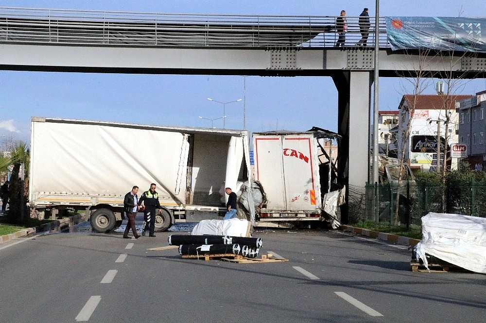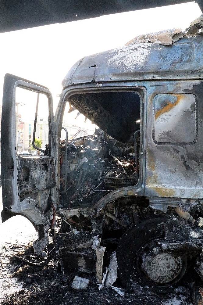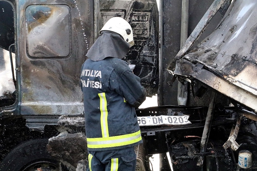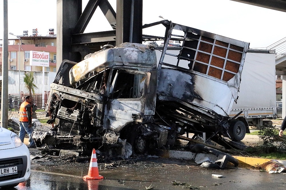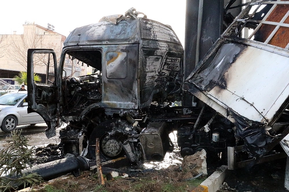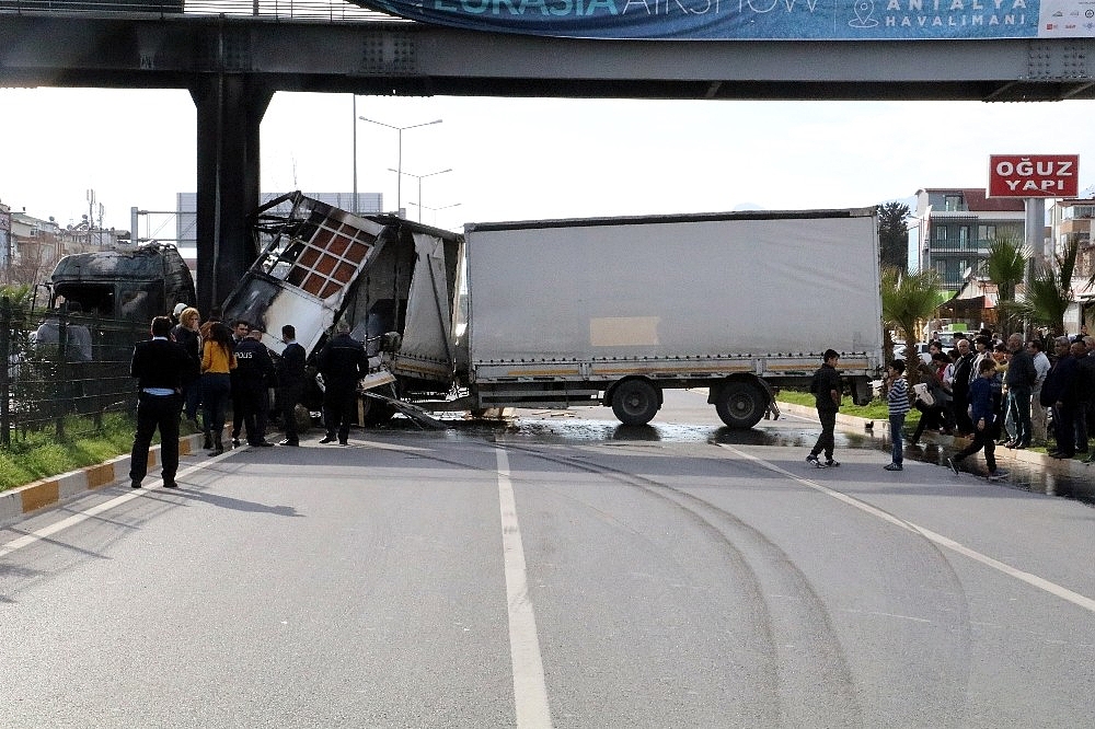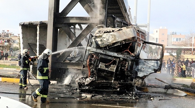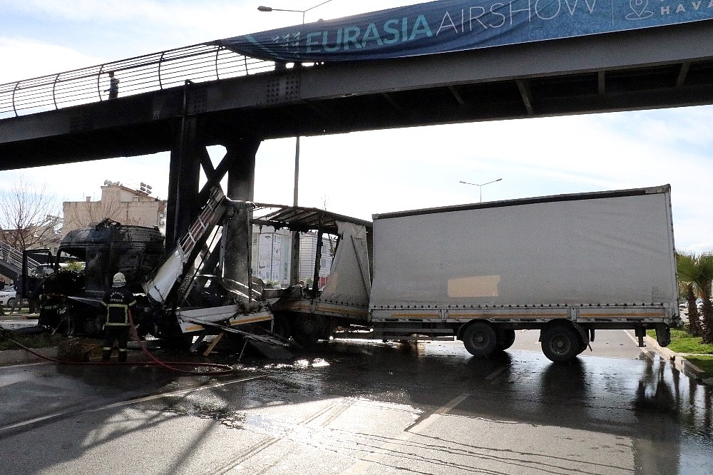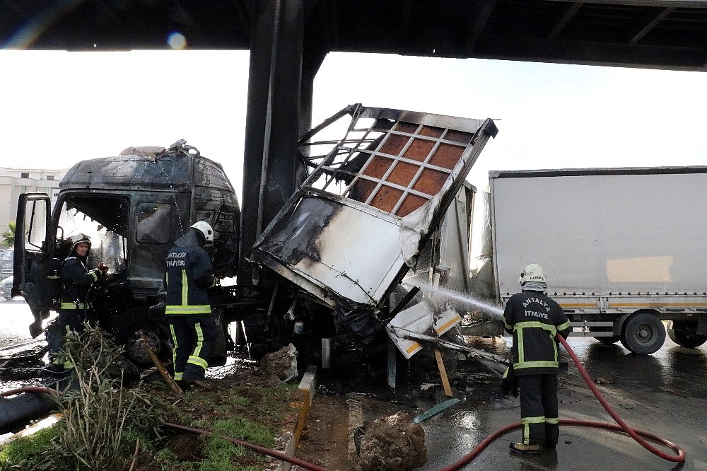 Antalya'da şoförün direksiyon hakimiyetini kaybettiği tır sürücüsü, üst geçidin refüjdeki ayaklarına çarparak alev aldı. Tır şoförü, çevredeki esnaf tarafından alev alev yanan aracın içinden son anda kurtarıldı.