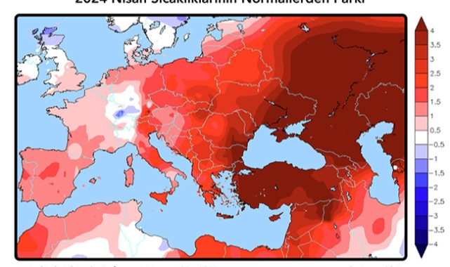 İstanbul Teknik Üniversitesi (İTÜ) Meteoroloji Mühendisliği Bölümü'nden Prof. Dr. Barış Önol, ECMWF sezonluk tahminlerine göre paylaştığı haritalarla, 2024 Nisan ayının Türkiye'de ölçülmüş en sıcak nisan olarak kayıtlara geçtiğini açıkladı. Prof. Dr. Önol, “2024 Nisan ayı Türkiye'de ölçülmüş en sıcak nisan olarak yaşandı. Sıcaklıklar neredeyse ülkenin tamamında normallerin 4 derece üzerinde rekor düzeyde gerçekleşti. Bu kadar geniş bir alan için çok ciddi değerler. Ve çok sıcak bir yaz kapıda" diye uyardı.