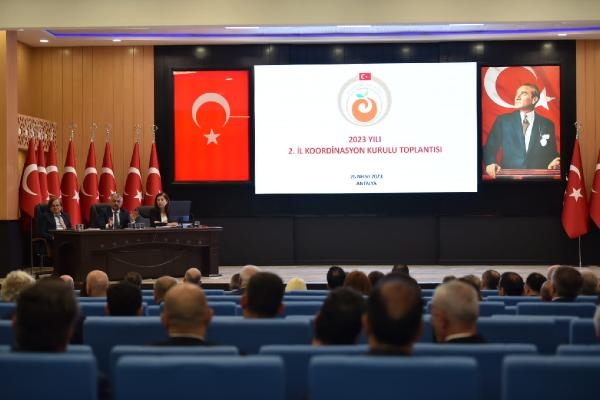 Antalya'daki yatırımların, sosyo-ekonomik gelişmelerin, yerel ve bölgesel kalkınma planlarının değerlendirileceği ve bunlara ilişkin sorunların çözümü noktasında kurumlar arası iş birliği ve koordinasyonu sağlamak için gerçekleştirilen 2023 yılının 2'nci İl Koordinasyon Kurulu Toplantısı, Vali Ersin Yazıcı başkanlığında İl Milli Eğitim Müdürlüğü'nde gerçekleşti. Toplantıya Antalya Büyükşehir Belediyesi Genel Sekreteri Cansel Tuncer, Akdeniz Üniversitesi Rektörü Prof. Dr. Özlenen Özkan, Alaaddin Keykubat Üniversitesi Rektörü Prof. Dr. Ekrem Kalan, Vali Yardımcıları, İlçe Kaymakamları, İl Jandarma Komutan Tuğgeneral Tarık Hekimoğlu, İl Emniyet Müdürü Orhan Çevik, Sahil Güvenlik Grup Komutanı Albay Murat Sezgin ile kamu kurum ve kuruluşlarının müdürleri katıldı.