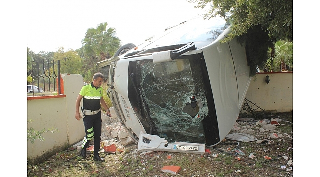 Antalya'nın Manavgat ilçesinde, tur midibüsünün virajı alamayarak uygulama otelinin duvarını aşması sonucu meydana gelen kazada 2 kişi yaralandı. Kaza, güvenlik kameraları tarafından görüntülendi.