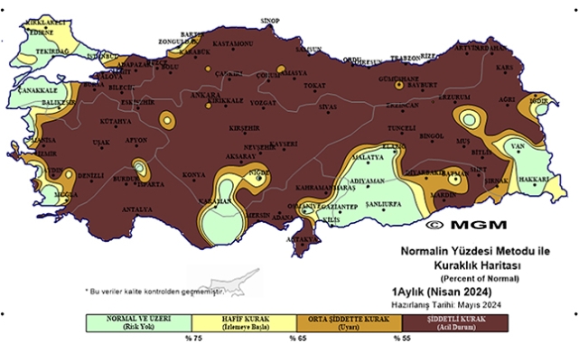 Meteoroloji Genel Müdürlüğü'nün 2024 Nisan ayı meteorolojik kuraklık durumuna ilişkin haritaları, birçok bölgede olağanüstü ve şiddetli kuraklık yaşandığı gösterdi. Normalin Yüzdesi İndeksi (PNI) haritasına göre Trakya, Çanakkale, Muğla, Mersin'in bazı bölgeleri, Güneydoğu Anadolu'nun batısı, Hakkari ve Van çevreleri haricindeki tüm Türkiye'de 'şiddetli kuraklık (acil durum)' ibaresine yer veriliyor. Türkiye'nin neredeyse yüzde 70'lik kısmının şiddetli kuraklık yaşadığını gösteren bu haritaya göre, geri kalan bölgelerin de yine önemli bölümü orta şiddete ve hafif kurak tehlikesi altında görülüyor.