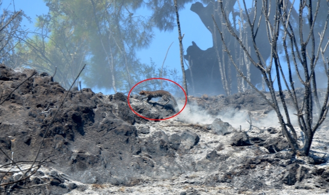 Yanan alanda, köz ve küllerin arasından kaçmaya çalışan sansar kameralara yansıdı. Jandarma yangınla ilgili inceleme başlattı.