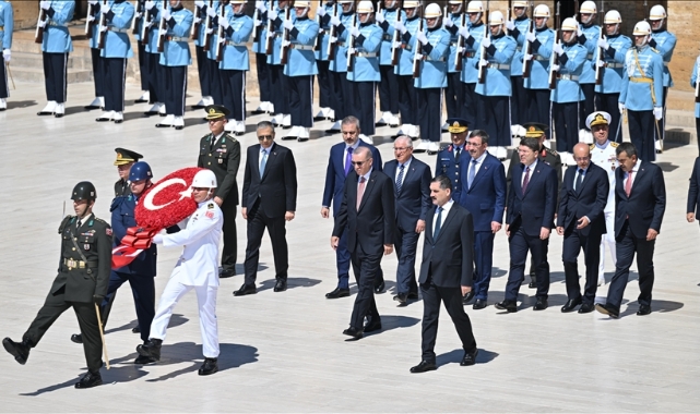 Cumhurbaşkanı Erdoğan'ın ay yıldız motifli çelengi Atatürk'ün mozolesine bırakmasının ardından saygı duruşunda bulunuldu, İstiklal Marşı okundu.