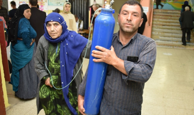 Yaşlı bir kadın, oksijen tüpüyle vatandaşlık görevini yerine getirdi