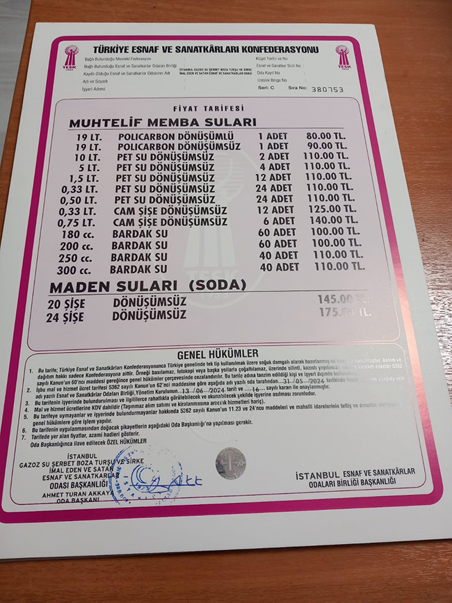 Markaların satış tarifesine uymamak için bayilerini esnaf odasına değil, ticaret odasına kaydettiriyorlar.“Böylece zorunlu tarifeden kaçınmış oluyorlar. Bu bahsettiğimiz markalar da piyasanın çoğunluğunu oluşturuyor. Esnaf odası olarak yabancı su markalarının zamlarını durduramıyoruz. Ne döviz, ne akaryakıt ne de asgari ücret artmadı. Buna rağmen son altı ayda iki defa su zammı gördük. Fırsatçılık yapıyorlar.”