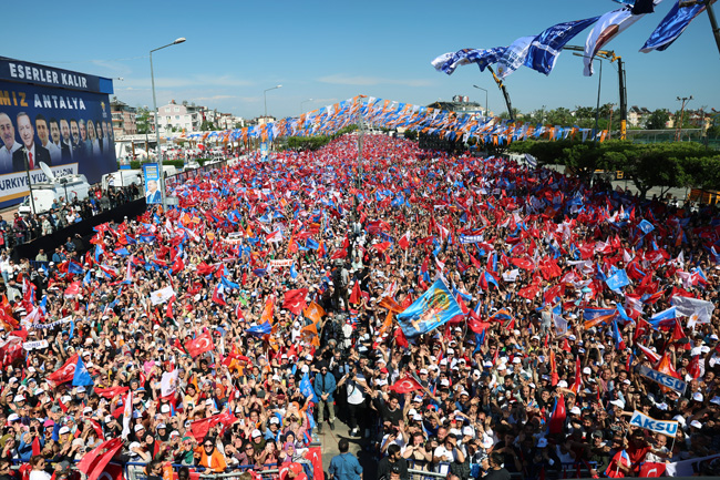 Cumhurbaşkanı Recep Tayyip Erdoğan, 14 Mayıs Cumhurbaşkanlığı ve 28'inci Dönem Milletvekilliği Genel Seçimleri kapsamında düzenlenen mitingde Antalyalılarla buluştu. Kepez Turgut Özal Spor Salonu önünde 100 bini aşkın kalabalığın katıldığı mitingde sahneye eşi Emine Erdoğan ile İbrahim Tatlıses'in 'Haydi Söyle' ile Cengiz Kurtoğlu'nun 'Duyanlara Duymayanlara' şarkılarının sözleri düzenlenmiş yeni halinden oluşan seçim şarkıları eşliğinde çıkan Cumhurbaşkanı Erdoğan, coşkulu kalabalığı selamladı. Şarkıların ardından kalabalığa, “ “Biz sizleri çok seviyoruz, sizlere olan aşkımız farklı ve bu yolda bizi hiç yalnız bırakmadınız” diyen Erdoğan, “Deniz kenarında kar mı olurmuş, meydana çıkmayan er mi olurmuş, deli gönül başka güzel arama, Antalya'dan güzel yar mı olurmuş?” şeklindeki dörtlüğü okudu ve “Biz de Antalya'dan güzel yar olmayacağını bilerek bu şehri hep gönülden sevdik. Antalya elindeki değerleri kazanca dönüştürmeyi, çalışmanın ve üretmenin değerini çok iyi bilir. Bu şehir ayrımcılığın hiçbir çeşidine itibar etmez" ifadelerini kullandı.