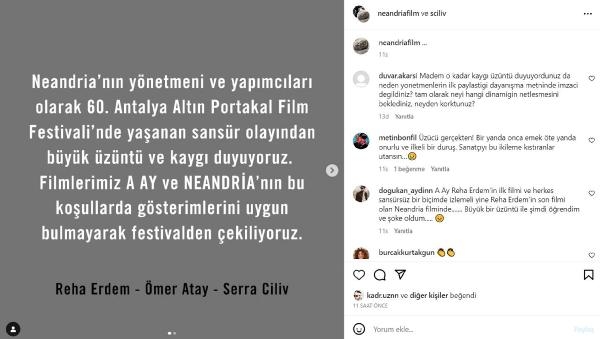 Geçen sene festivalde Yaşam Boyu Başarı Ödülü alan Zerrin Tekindor, paylaşıma 'Güzelim festivalin düştüğü duruma bak. Yazıklar olsun' diye yorum yaptı. Diğer yandan Altın Portakallı yönetmen Reha Erdem, özel gösterimle yayınlanacak ilk filmi 1988 yapımı 'A Ay' ile son filmi Neandria'nın mevcut koşullarda yayınlanmasını doğru bulmadığını belirterek, festivalden çekildiklerini açıkladı. Festivalin jürilerinden Ezel Akay, sosyal medya hesabından 'Rezalet üzerine rezalet' paylaşımında bulundu.