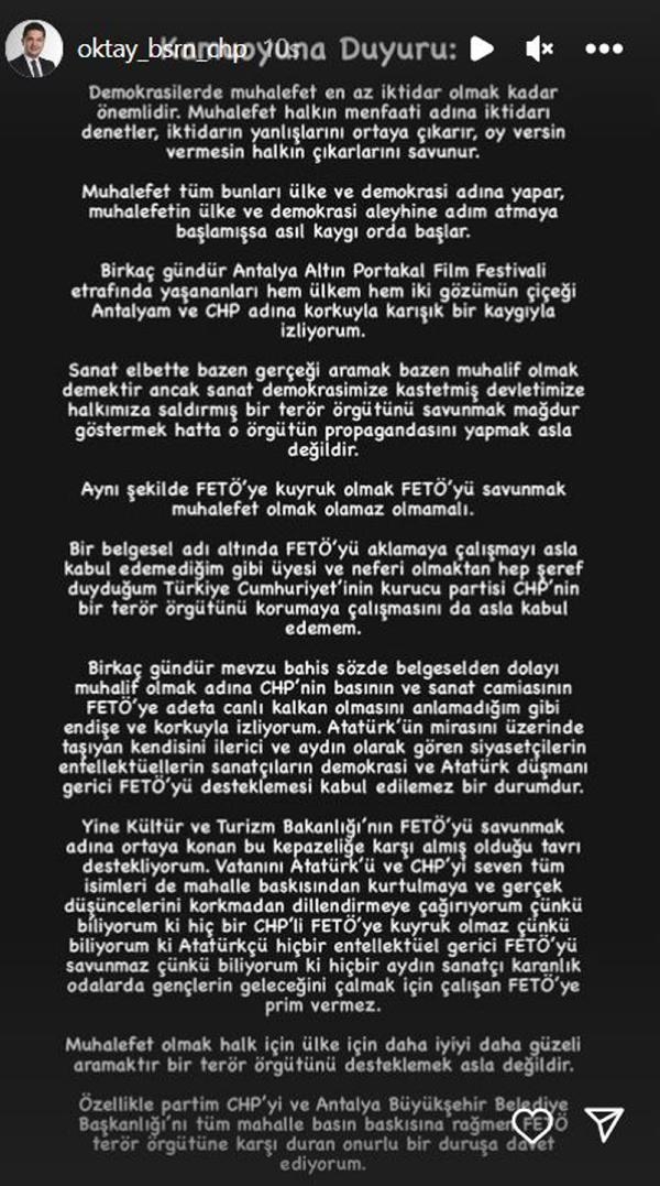 "Sanat, elbette bazen gerçeği aramak, bazen muhalif olmak demektir ancak sanat demokrasimize kastetmiş, devletimize, halkımıza saldırmış bir terör örgütünü savunmak, mağdur göstermek, hatta o örgütün propagandasını yapmak asla değildir. Bir belgesel adı altında FETÖ'yü aklamaya çalışmayı asla kabul edemediğim gibi üyesi ve neferi olmaktan hep şeref duyduğum Türkiye Cumhuriyeti'nin kurucu partisi CHP'nin bir terör örgütünü korumaya çalışmasını da asla kabul edemem. Muhalefet olmak halk için, ülke için daha iyiyi, daha güzeli aramaktır. Bir terör örgütünü desteklemek asla değildir. Özellikle partim CHP'yi ve Antalya Büyükşehir Belediye Başkanlığı'nı tüm mahalle baskısına rağmen FETÖ terör örgütüne karşı onurlu bir duruşa davet ediyorum."