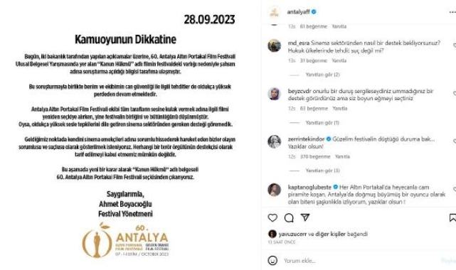Türkiye'nin en uzun soluklu film festivali olan ve bu yıl 60'ıncısı gerçekleşecek Antalya Altın Portakal Film Festivali, 7-14 Ekim tarihleri arasında düzenlenecek. Festivalde, 'Ulusal belgesel Film Yarışması'nda 8 film yarışmaya hak kazandı. Altın Portakal Film Festivali Yönetmeni Ahmet Boyacıoğlu, 'Kanun Hükmü' filminde yer alan kişiyle ilgili yargı sürecinin devam ettiği gerekçisiyle filmin yarışma seçkisinden çıkarıldığını açıkladı. Buna tepki gösteren filmin yönetmeni Nejla Demirci, kararın sinema ve belgesellere yapılan bir darbe olduğunu belirtti. Festivalin Ulusal Uzun Metraj Film Yarışması, Ulusal Belgesel Film Yarışması, Ulusal Kısa Metraj Film Yarışması, Edebiyat Uyarlaması Senaryo Yarışması ve Belgesel Film Yarışması jüri üyeleri, meslektaşlarıyla yan yana duracaklarını açıkladı. Jüri üyeleri imzalı ortak açıklamada, filmin Belgesel Yarışma seçkisine geri alınmasıyla görevlerini yerine getireceklerini açıkladı.