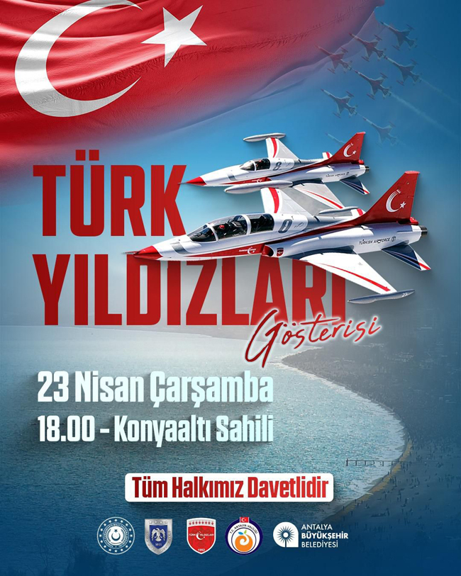 Antalya Büyükşehir Belediyesi Kültür ve Sosyal İşler Dairesi Başkanlığı tarafından hazırlanan program kapsamında, Antalya Valiliği işbirliği ile Türk Yıldızları gösterisi kutlamalara renk ve heyecan katacak. Türkiye’nin çelik kanatları Türk Yıldızları, 23 Nisan Ulusal Egemenlik ve Çocuk Bayramı’nda Antalya’da unutulmaz bir gösteriye imza atmaya hazırlanıyor. Hava Kuvvetleri Komutanlığı’na bağlı akrobasi timi, Antalya’nın dünyaca ünlü Konyaaltı Sahili’nde gökyüzünü sanatla buluşturacak. 18.00’de başlayacak olan gösteri, hem çocuklara hem de yetişkinlere görsel bir şölen sunacak. Bayram coşkusunu gökyüzüne taşıyacak bu özel etkinlik, Antalyalılar tarafından heyecanla bekleniyor.