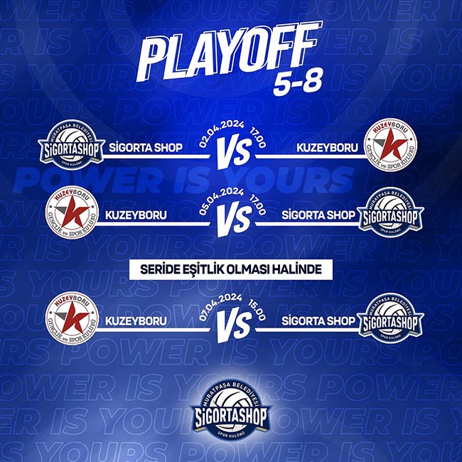 Muratpaşa Belediyesi Sigorta Shop Spor Kulübü, play-off mücadelesinde ligi 5’inci basamakta tamamlayan Kuzeyboru ile eşleşti. Muratpaşa Belediyesi, ilk maça 2 Nisan Salı günü saat 17.00’de kendi sahasında çıkacak. İkinci maç ise 5 Nisan Cuma günü saat 17.00’de Aksaray Spor Salonu’nda oynanacak. İki maç sonucunda kazanan olmazsa, 3’üncü maç 7 Nisan Pazar günü yine Aksaray Spor Salonu’nda oynanacak. İki maçı kazanan play-off ilk turu geçerek 5’incilik maçı oynamaya hak kazanacak. (www.akdenizmanset.com.tr)